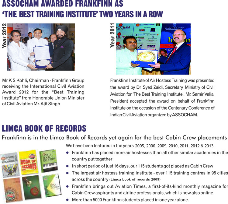 Frankfinn is known for its World's No.1 Air Hostess Training Institute. And not without reasons. The network is the largest in the world. Frankfinn has also produced more air hostesses than all other academies put together. In fact, Frankfinn placements are far more than the nearest competitor, a feat acknowledged by none other than the Limca Book of Records. Frankfinn's highly specialised training by master trainers produce highly skilled students who enjoy a distinct edge in their prospects for jobs.